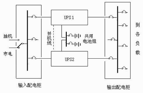 提到雙機并聯方案,人們往往會認為投資成本至少是單機方案的2倍,其實也未必,因為UPS主機冗余,電池沒必要再跟著冗余,一旦UPS故障,它所配帶的電池再多再好都沒有用了,所以只要能保證當一臺UPS故障后它所配備的電池能夠全部安全地轉移給另外一臺UPS使用就行了。雖然電池的數量沒有冗余,但負載的后備時間將不受任何影響,這就是共享電池組方案。