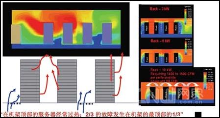 不知道數(shù)據(jù)中心是否做過(guò)這樣的統(tǒng)計(jì),但是根據(jù)艾默生所提供的數(shù)據(jù),大約有2/3的服務(wù)器故障會(huì)發(fā)生機(jī)架最頂部的1/3,產(chǎn)生這種問(wèn)題的原因在于機(jī)架頂部的服務(wù)器經(jīng)常過(guò)熱。