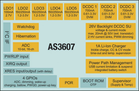 AS3607完全可編程電源管理單元包括:3個DC-DC降壓轉換器和5個適合RF應用的低噪聲LDO穩壓器、1個LED背光驅動器、2個可編程電流源和1個強大的鋰電池充電器。3個降壓轉換器每個都能提供700mA的電流,效率高達95%,極大地延長了電池壽命。2 MHz固定開關頻率允許采用微型薄電感,最大限度減小了PCB占位尺寸。