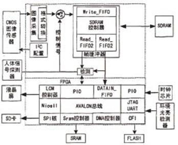 為了實現(xiàn)自動圖像報警和圖像采集,本文設(shè)計了動體檢測算法,這是因為絕大多數(shù)情況下我們只對監(jiān)控區(qū)域中運(yùn)動的物體感興 趣,這樣可以過濾掉只包含靜態(tài)背景的圖像,從而降低了對有限的嵌入式硬件資源的消耗。由于活動物體大多是人,而且這也是圖像監(jiān)控的目標(biāo),為此加入了人體信 號探測器,用以輔助動體檢測,以達(dá)到降低圖像報警誤報率的目的。本系統(tǒng)主要集成了圖像采集、控制和存儲等器件或芯片,組成了以FPGA為控制核心的實時圖 像監(jiān)控系統(tǒng)。系統(tǒng)的總體方案如圖1所示。